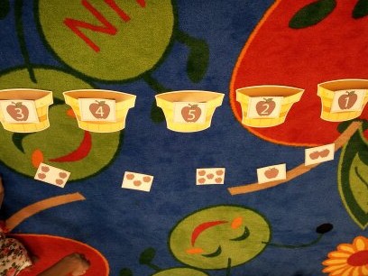 Pre-K children often come to school with the ability to rote count to 10 or 20 but most of the time they cannot connect the counting to the number. In order to facilitate this connection I taught a very simple lesson during group time on the carpet. I took my apple number and graphic cards and also found some basket cut outs. I lined the baskets on the carpet and placed the numbers 1-5 in order on the baskets. I then laid out the graphic cards out of order. I called on a few children to come count the apples and match them to the proper basket.